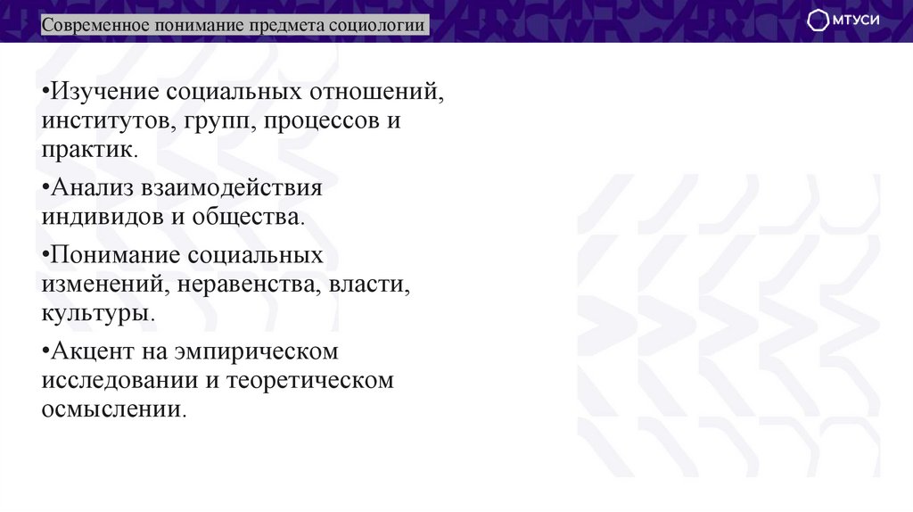 Современное понимание предмета социологии•Изучение социальных отношений,