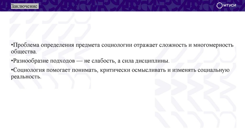 Заключение•Проблема определения предмета социологии отражает сложность и многомерность