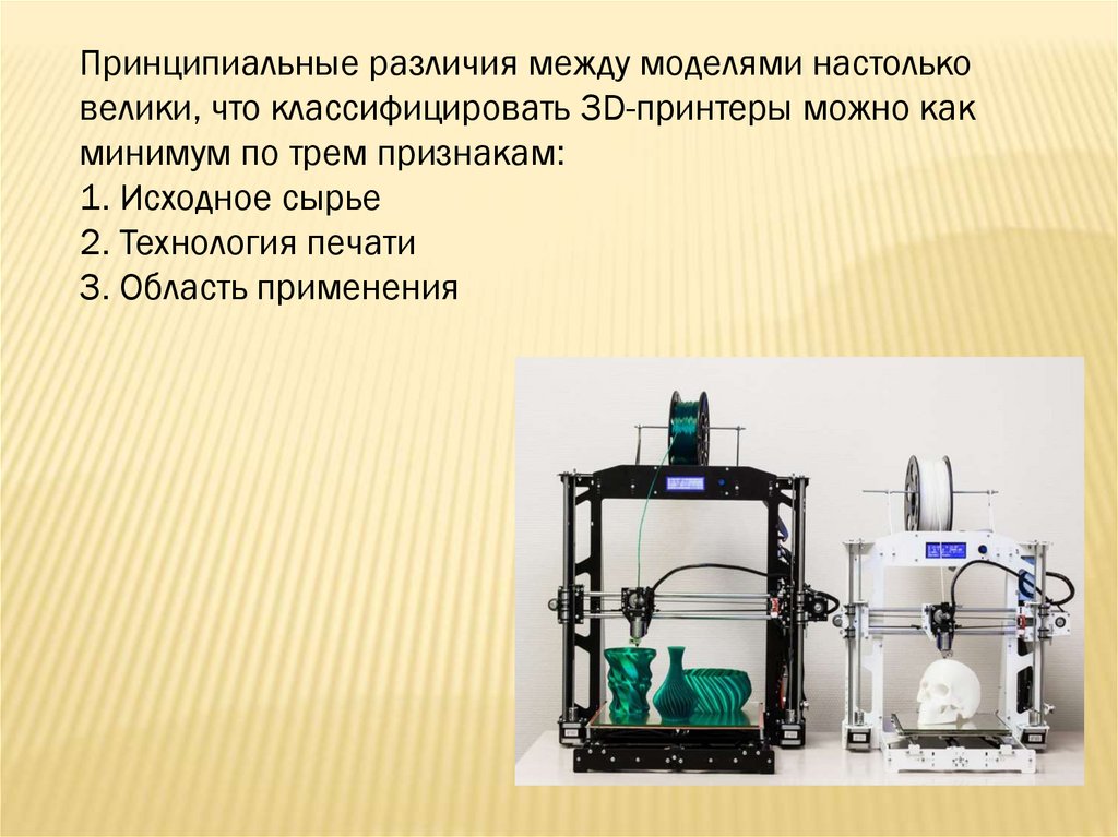 Принципиальные различия между моделями настольковелики, что классифицировать 3D-принтеры можно как