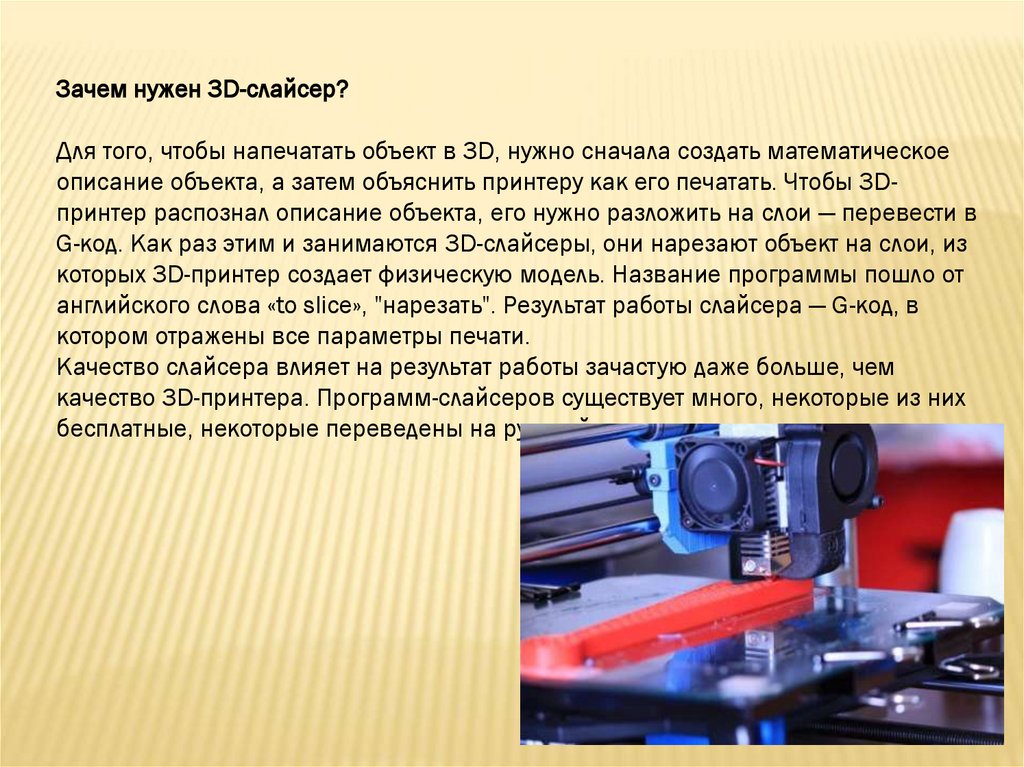 английского слова «to slice», "нарезать". Результат работы слайсера — G-код, в