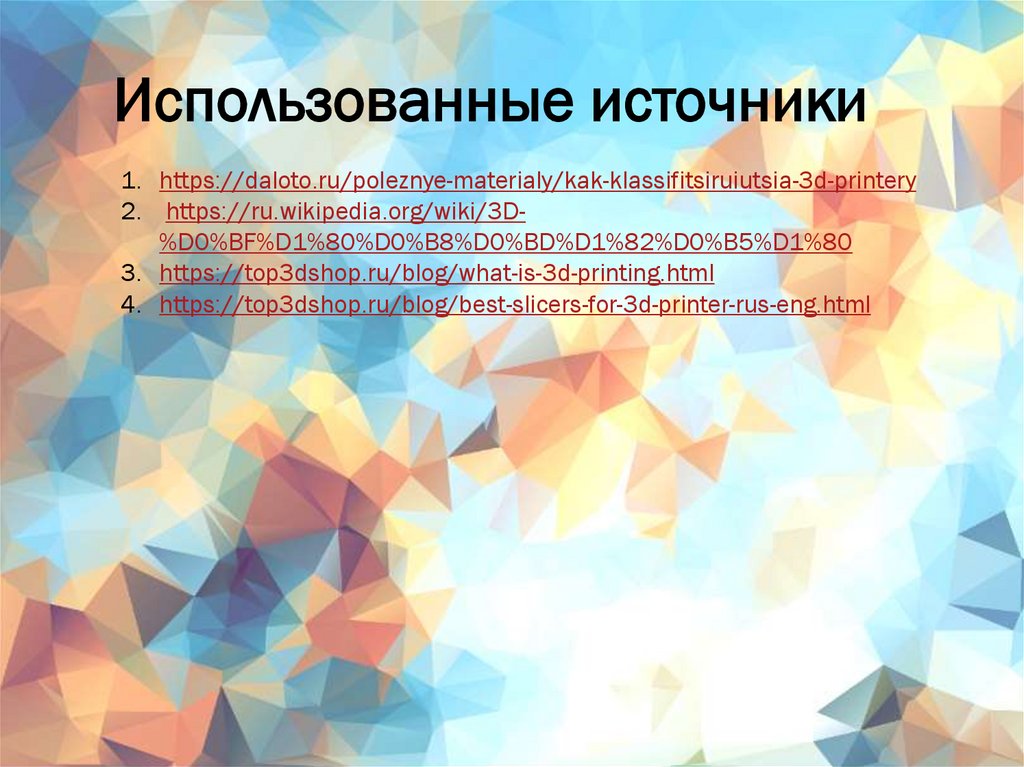 Использованные источники1. https://daloto.ru/poleznye-materialy/kak-klassifitsiruiutsia-3d-printery