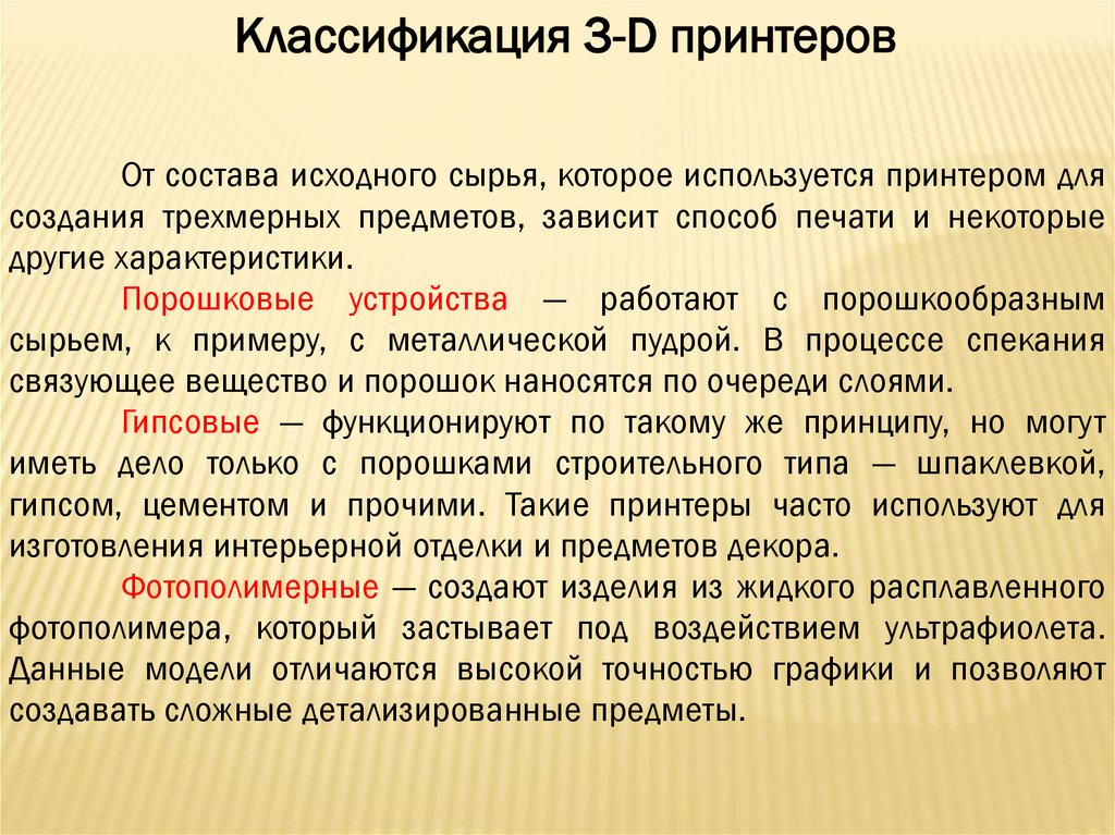 Классификация 3-D принтеровОт состава исходного сырья, которое используется принтером для