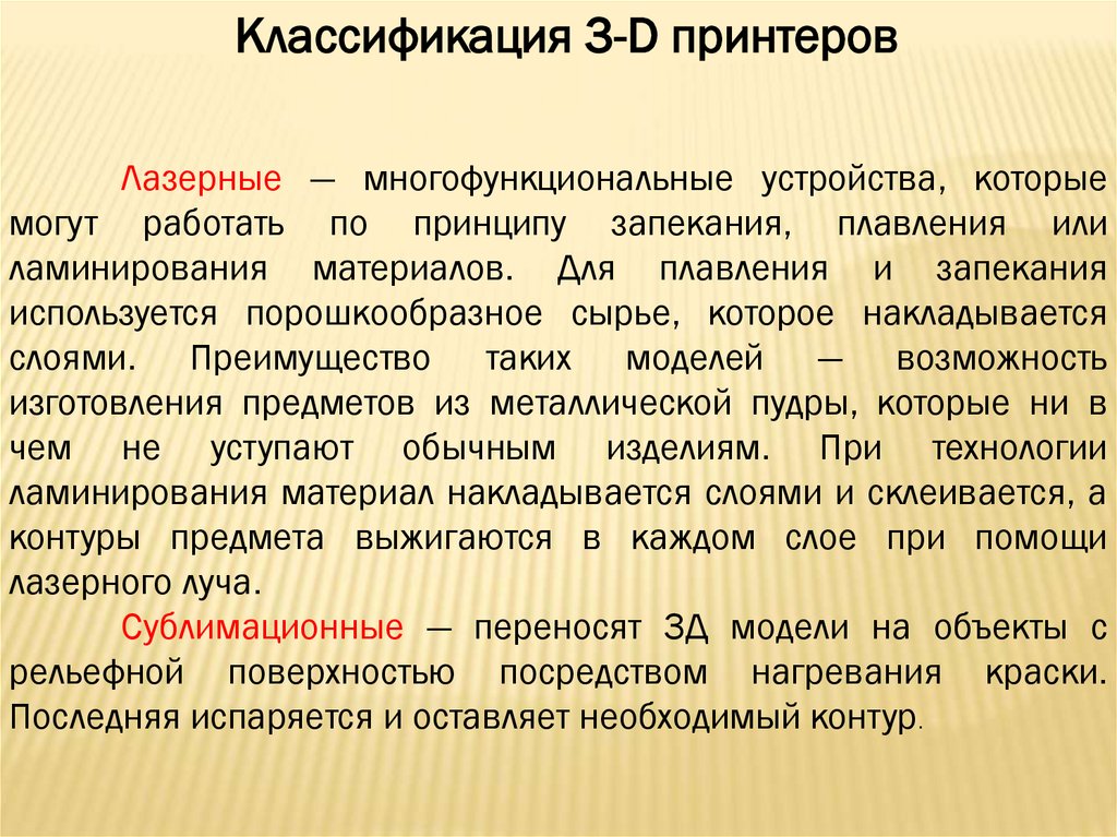Классификация 3-D принтеровЛазерные — многофункциональные устройства, которые