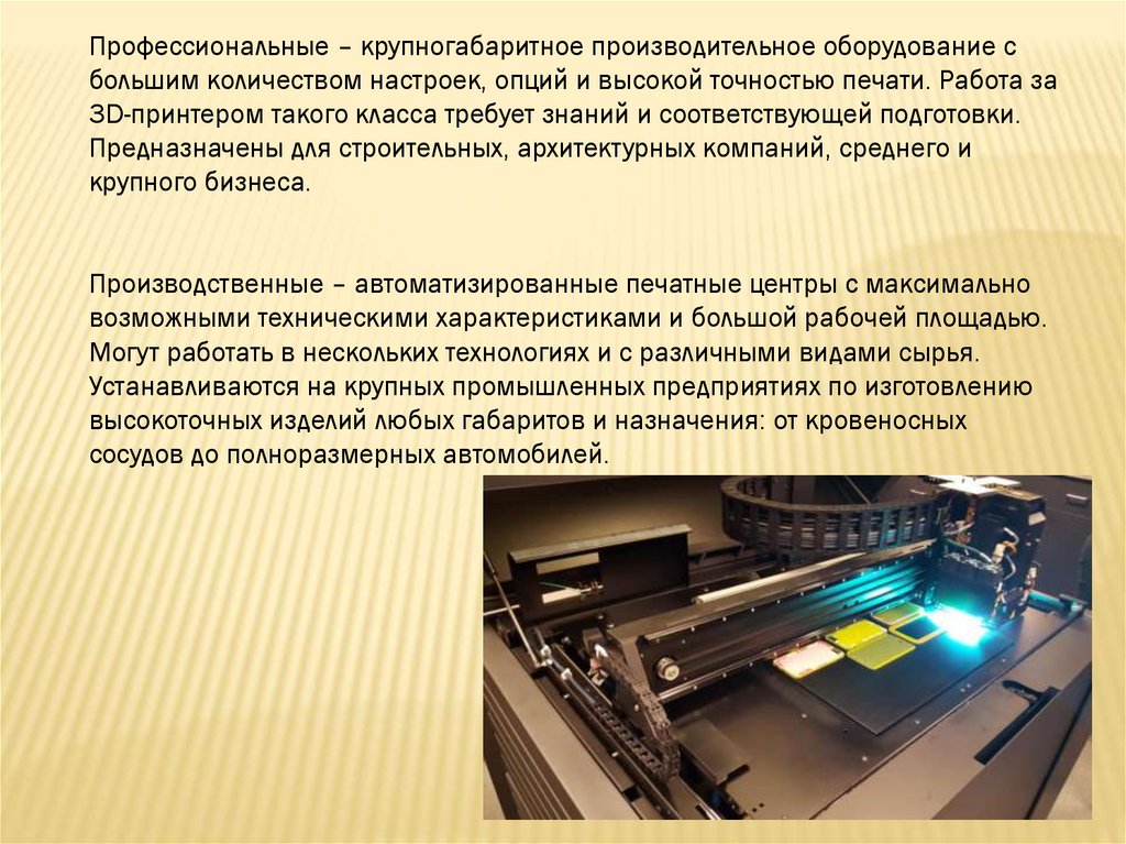 Профессиональные – крупногабаритное производительное оборудование сбольшим количеством настроек, опций и высокой точностью печати. Работа за