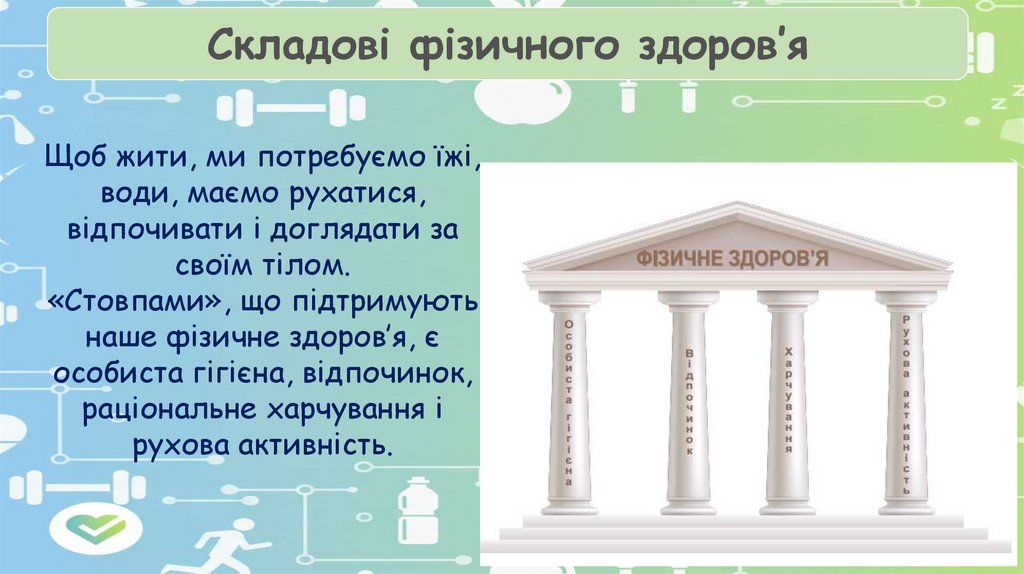 Складові фізичного здоров’яЩоб жити, ми потребуємо їжі,