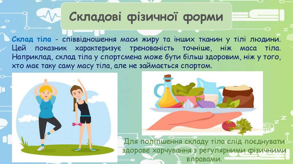 Складові фізичної формиСклад тіла - співвідношення маси жиру та інших тканин у тілі людини.