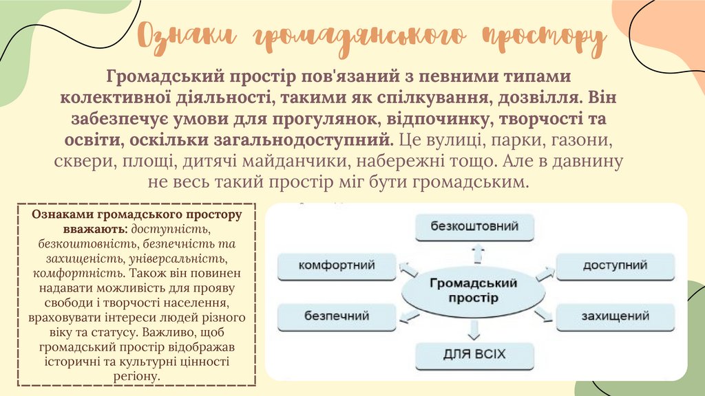 Ознаки громадянського просторуГромадський простір пов'язаний з певними типами