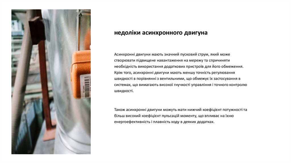 недоліки асинхронного двигунаАсинхронні двигуни мають значний пусковий струм, який може