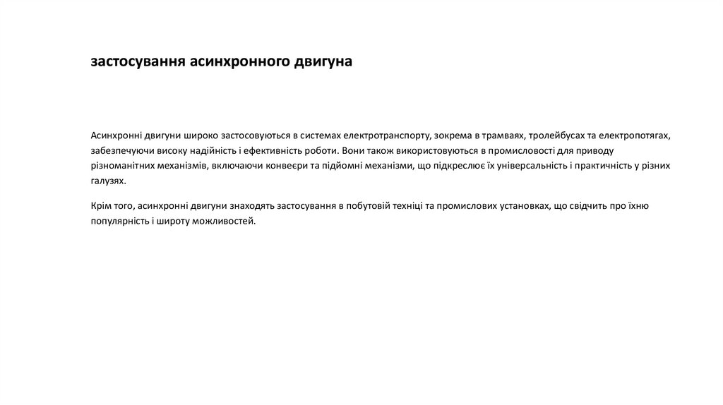 Крім того, асинхронні двигуни знаходять застосування в побутовій техніці та промислових установках, що свідчить про їхню