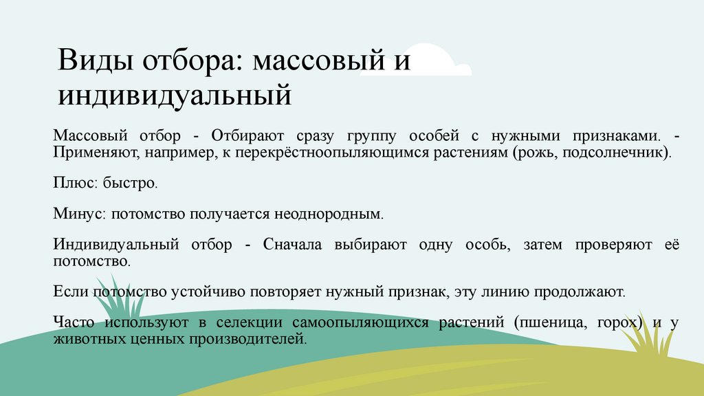 Массовый отбор - Отбирают сразу группу особей с нужными признаками. Применяют, например, к перекрёстноопыляющимся растениям (рожь, подсолнечник).