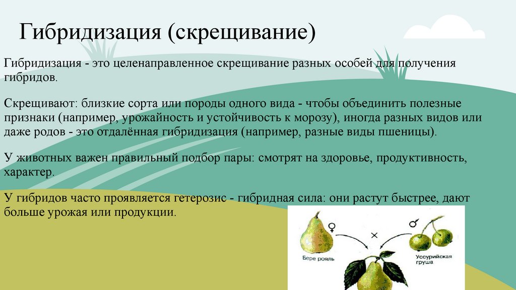Гибридизация (скрещивание)Гибридизация - это целенаправленное скрещивание разных особей для получения