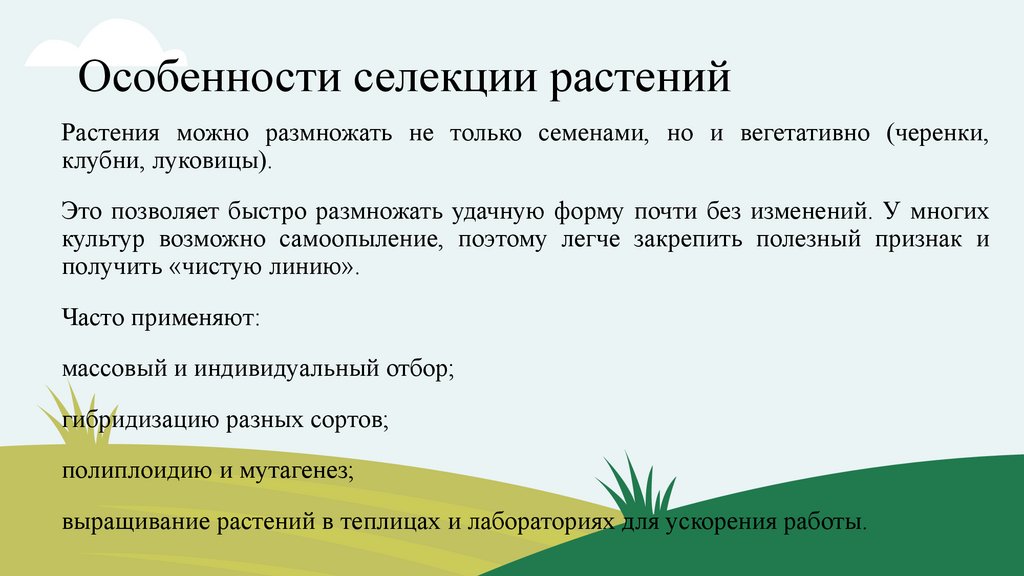 Особенности селекции растенийРастения можно размножать не только семенами, но и вегетативно (черенки,