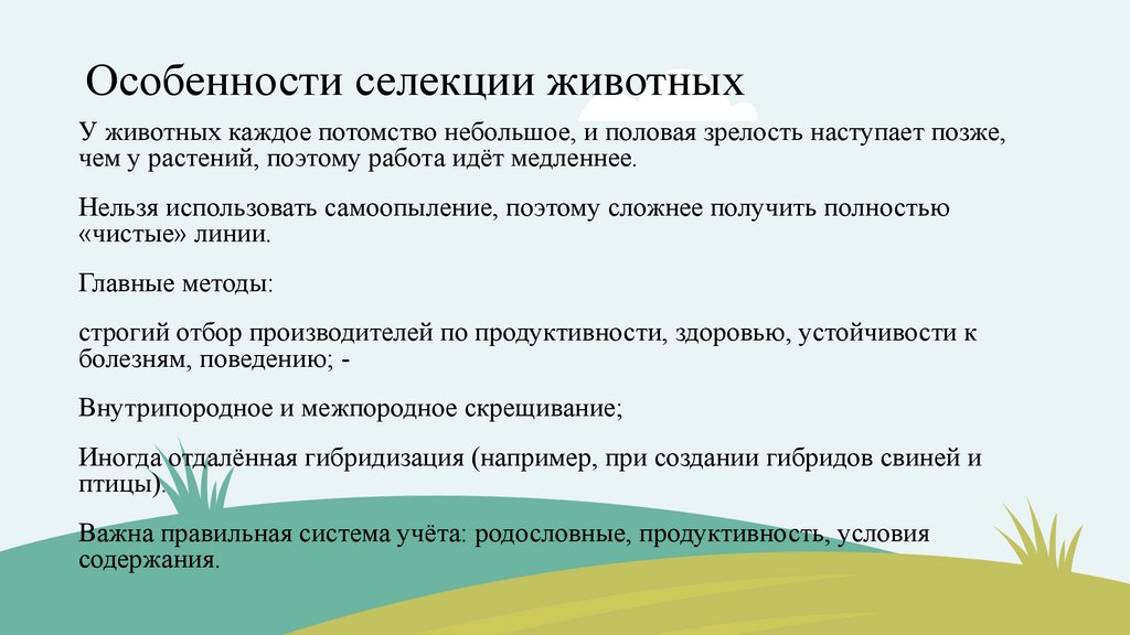 Особенности селекции животныхУ животных каждое потомство небольшое, и половая зрелость наступает позже,