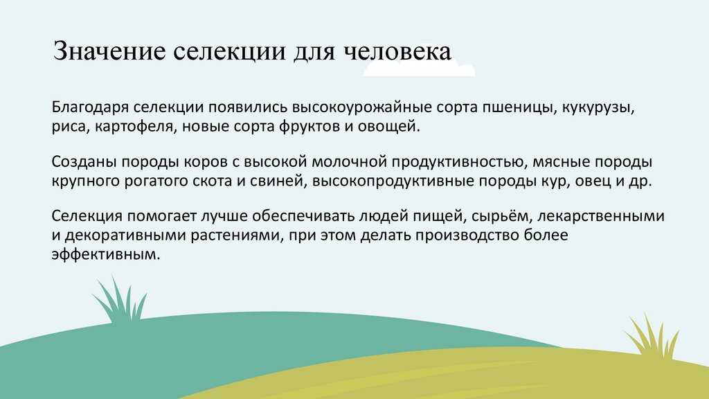 Значение селекции для человекаБлагодаря селекции появились высокоурожайные сорта пшеницы, кукурузы,