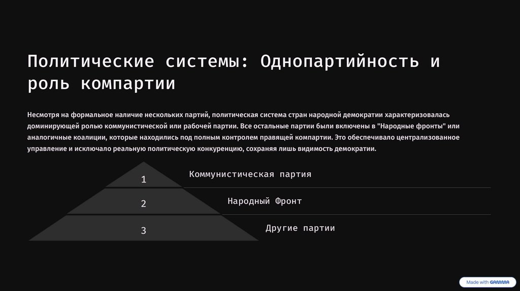 Несмотря на формальное наличие нескольких партий, политическая система стран народной демократии характеризовалась