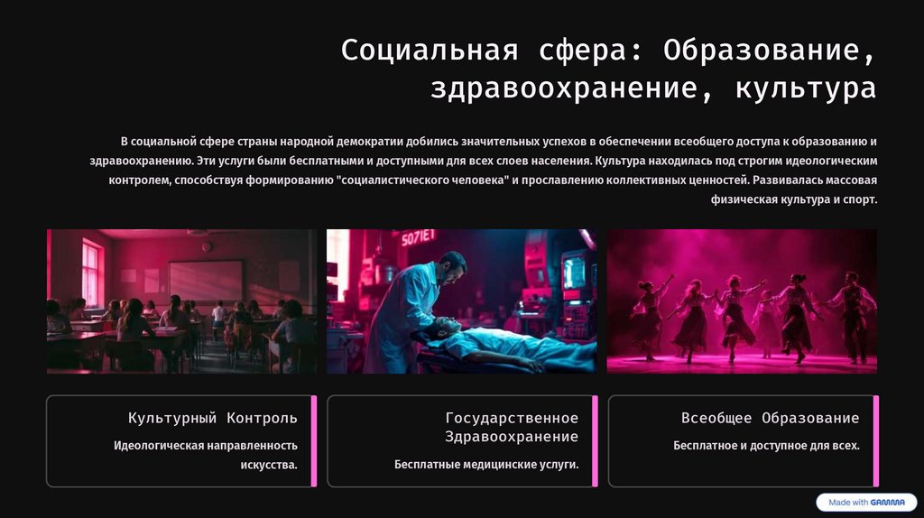 здравоохранению. Эти услуги были бесплатными и доступными для всех слоев населения. Культура находилась под строгим идеологическим