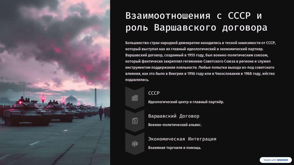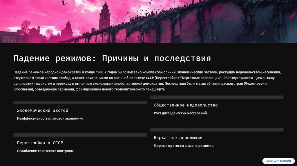 Падение режимов: Причины и последствияПадение режимов народной демократии в конце 1980-х годов было вызвано комплексом причин: экономическим застоем, растущим недовольством населения,