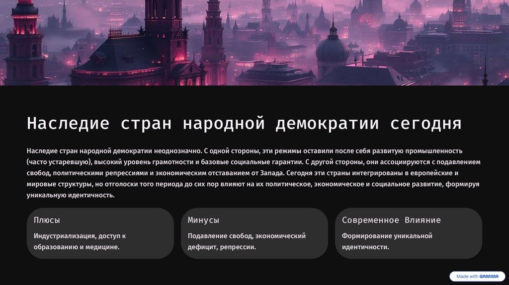 Наследие стран народной демократии сегодняНаследие стран народной демократии неоднозначно. С одной стороны, эти режимы оставили после себя развитую промышленность