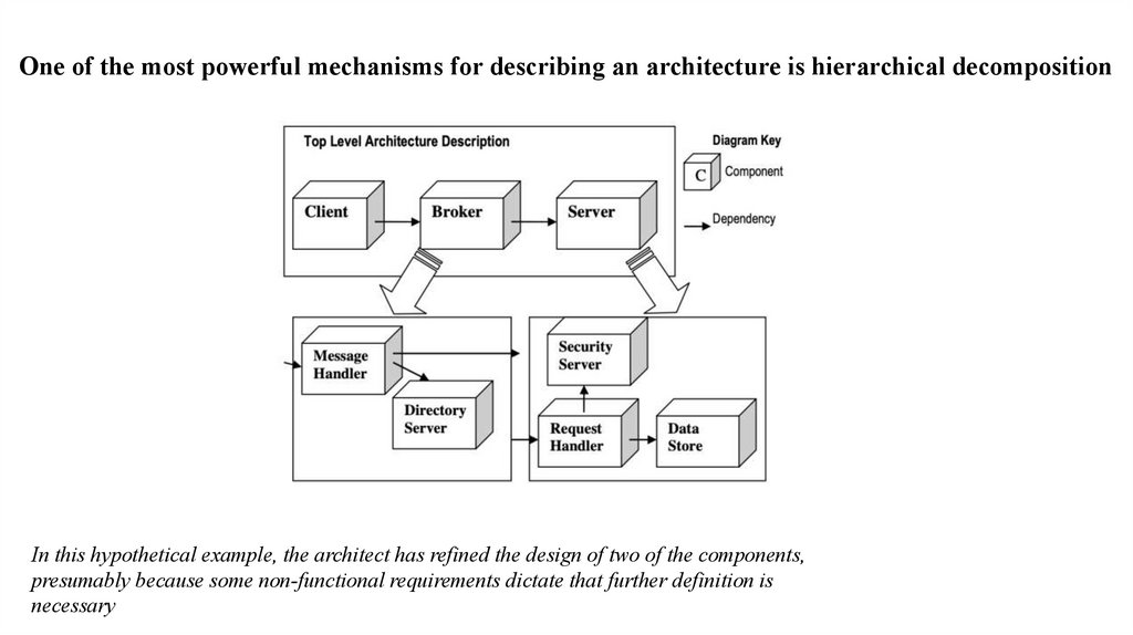 One of the most powerful mechanisms for describing an architecture is hierarchical decompositionIn this hypothetical example, the architect has refined the design of two of the components,