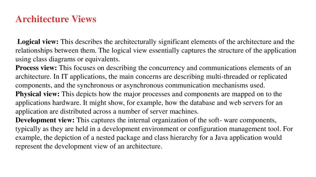 Architecture ViewsLogical view: This describes the architecturally significant elements of the architecture and the