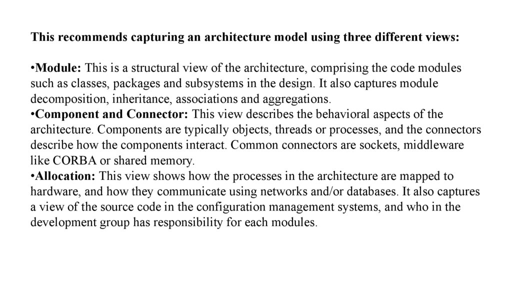 This recommends capturing an architecture model using three different views:•Module: This is a structural view of the architecture, comprising the code modules