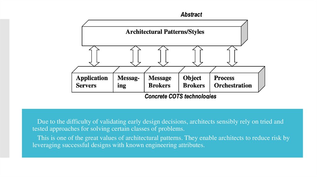 Due to the difficulty of validating early design decisions, architects sensibly rely on tried andtested approaches for solving certain classes of problems.