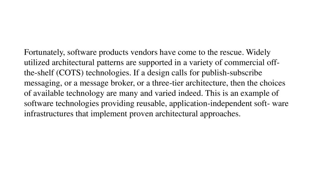 Fortunately, software products vendors have come to the rescue. Widelyutilized architectural patterns are supported in a variety of commercial offthe-shelf (COTS) technologies. If a design calls for publish-subscribe