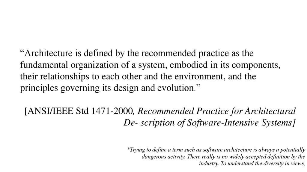 Software architecture is a fairly well defined and understooddesign discipline. However, just because we know what it is