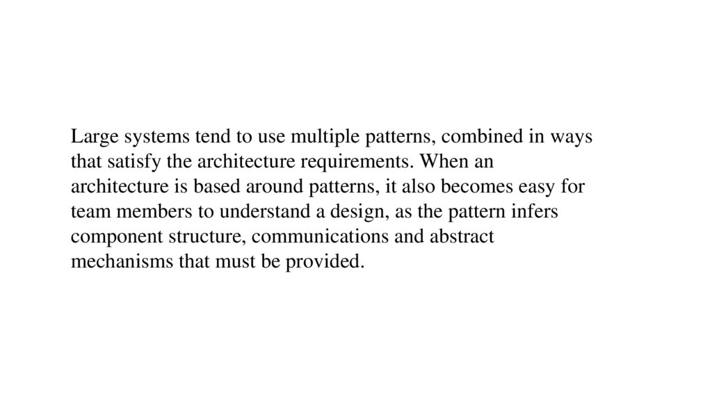 Large systems tend to use multiple patterns, combined in waysthat satisfy the architecture requirements. When an