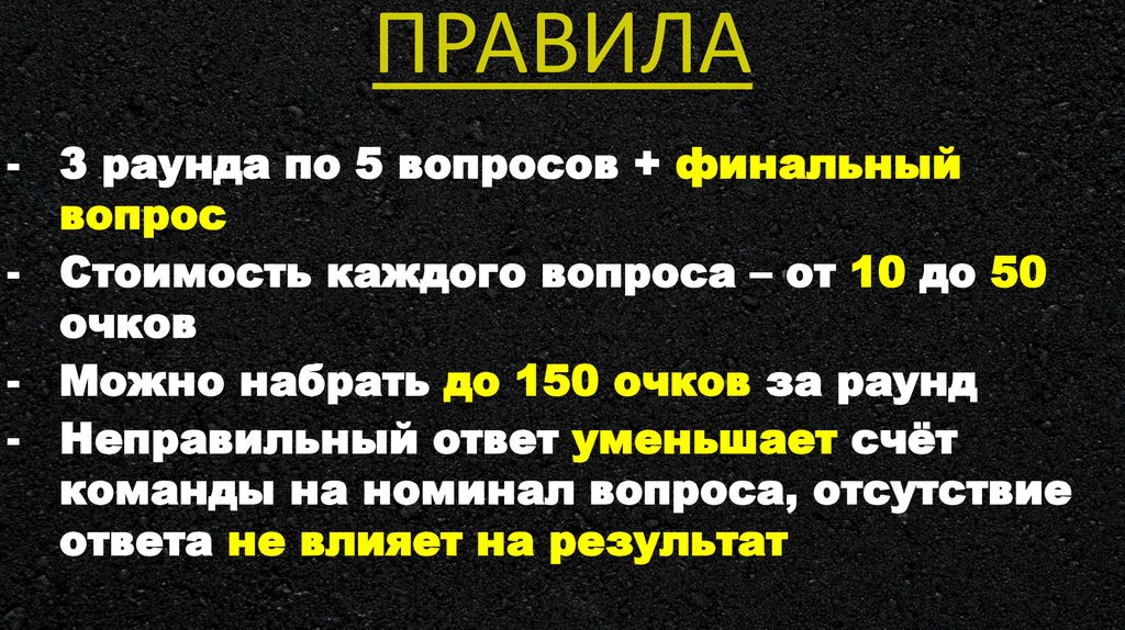 ПРАВИЛА- 3 раунда по 5 вопросов + финальный
