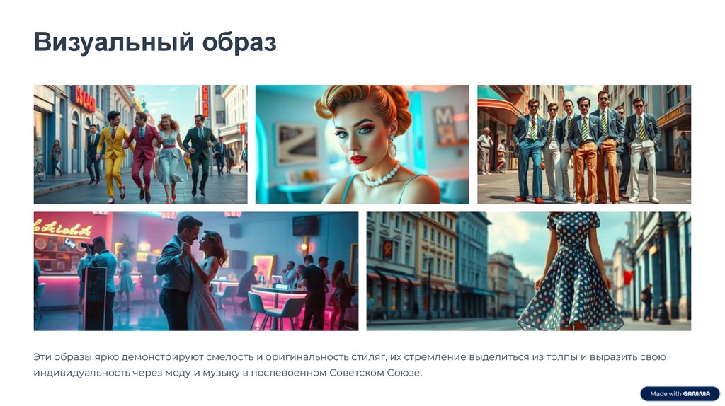 Визуальный образЭти образы ярко демонстрируют смелость и оригинальность стиляг, их стремление выделиться из толпы и выразить свою