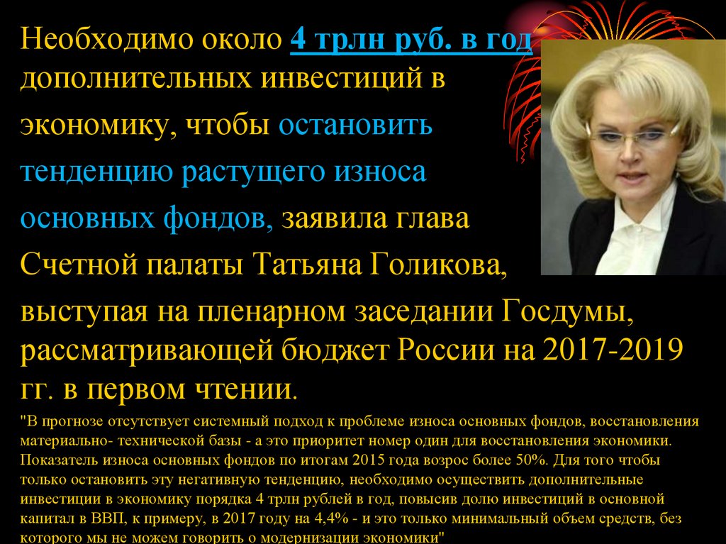 инвестиции в экономику порядка 4 трлн рублей в год, повысив долю инвестиций в основной