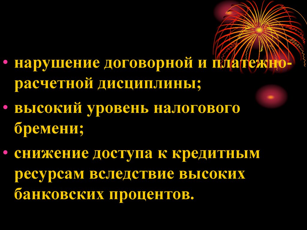 • нарушение договорной и платежнорасчетной дисциплины;• высокий уровень налогового