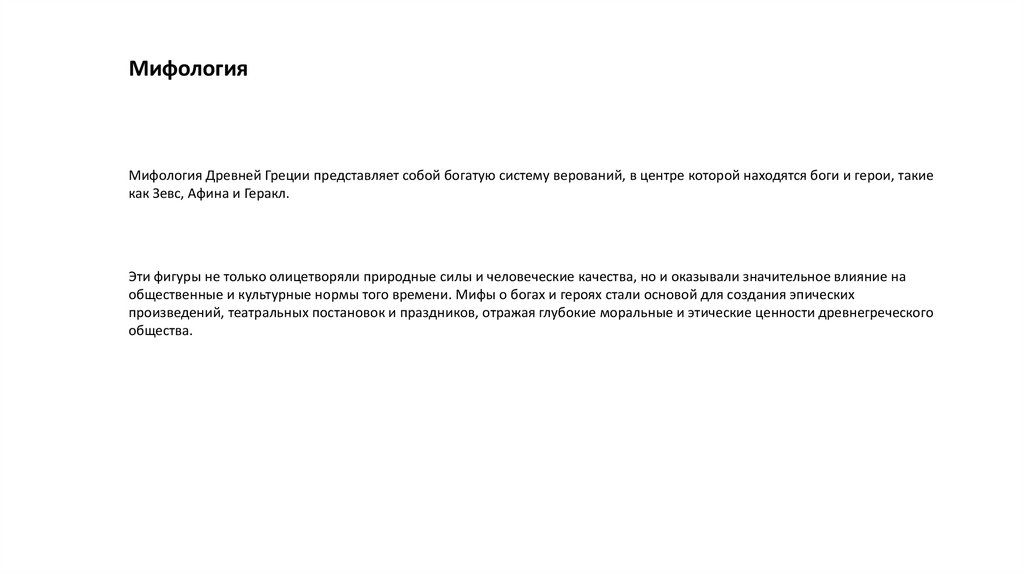 МифологияМифология Древней Греции представляет собой богатую систему верований, в центре которой находятся боги и герои, такие