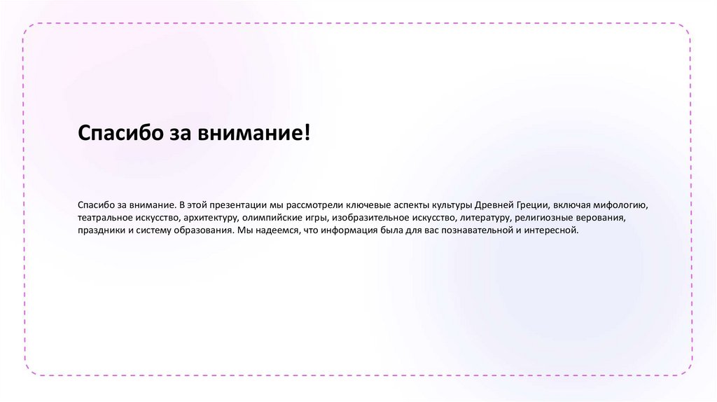 Спасибо за внимание!Спасибо за внимание. В этой презентации мы рассмотрели ключевые аспекты культуры Древней Греции, включая мифологию,