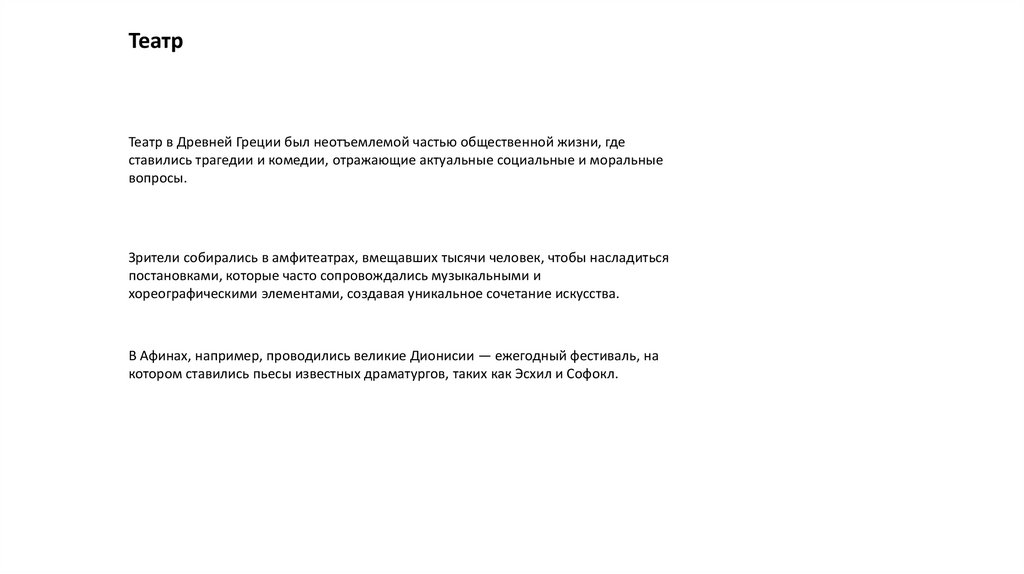 ТеатрТеатр в Древней Греции был неотъемлемой частью общественной жизни, где