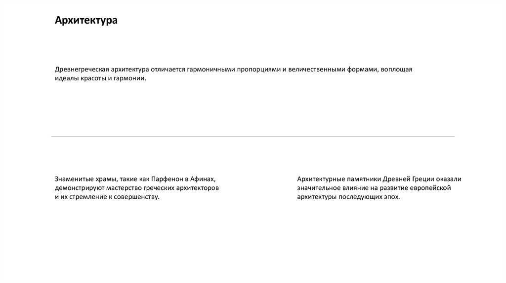 АрхитектураДревнегреческая архитектура отличается гармоничными пропорциями и величественными формами, воплощая