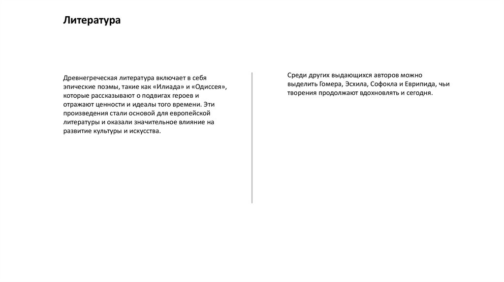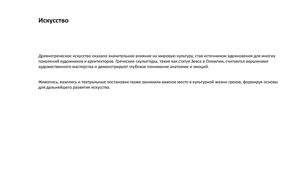 ИскусствоДревнегреческое искусство оказало значительное влияние на мировую культуру, став источником вдохновения для многих