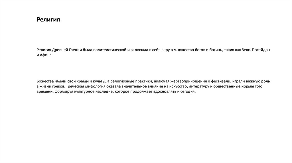 РелигияРелигия Древней Греции была политеистической и включала в себя веру в множество богов и богинь, таких как Зевс, Посейдон