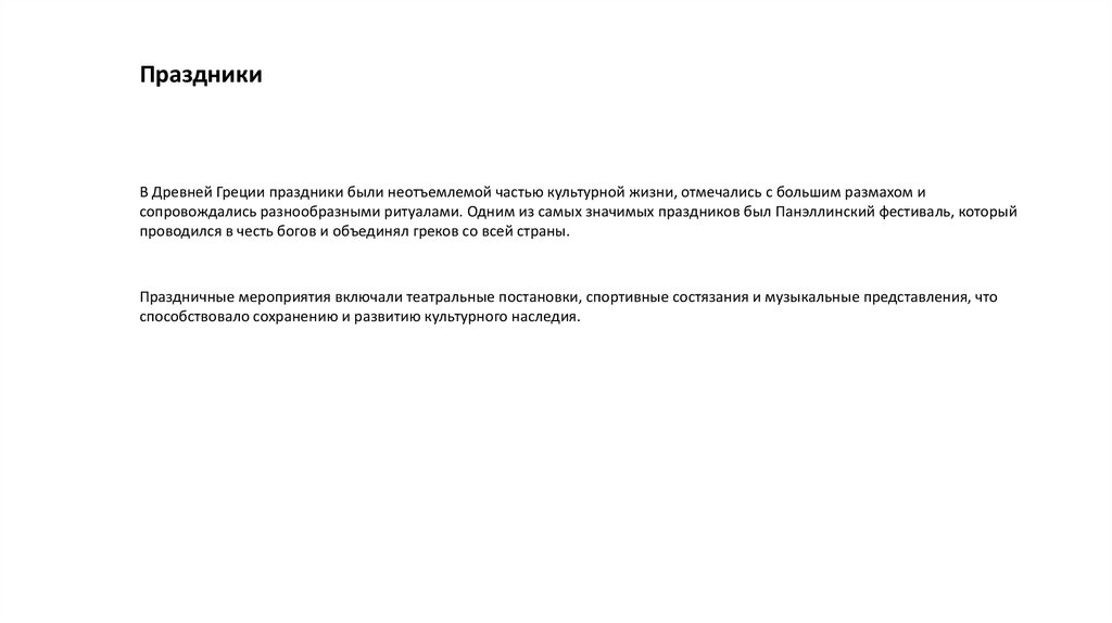 ПраздникиВ Древней Греции праздники были неотъемлемой частью культурной жизни, отмечались с большим размахом и