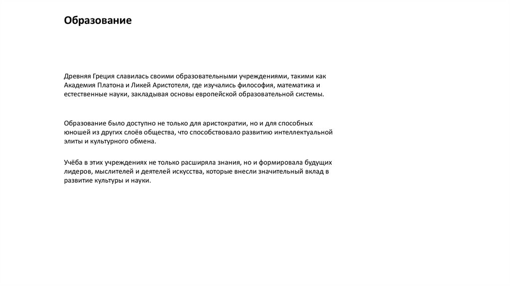 ОбразованиеДревняя Греция славилась своими образовательными учреждениями, такими как