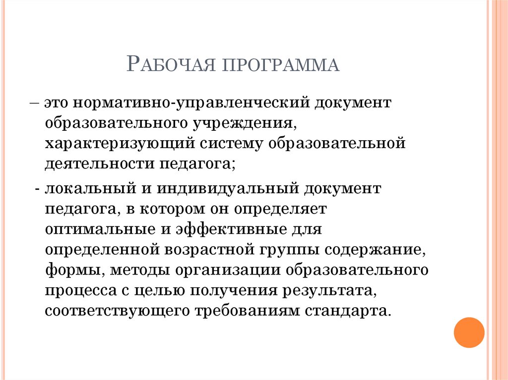 РАБОЧАЯ ПРОГРАММА– это нормативно-управленческий документ