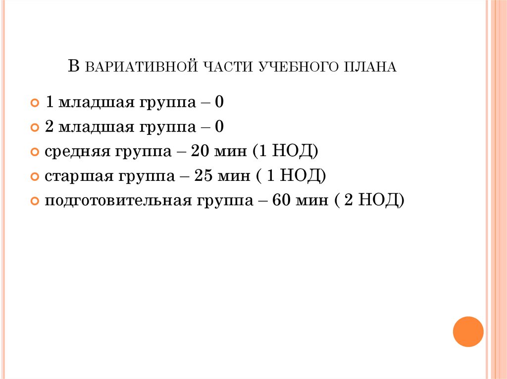 В ВАРИАТИВНОЙ ЧАСТИ УЧЕБНОГО ПЛАНА1 младшая группа – 0