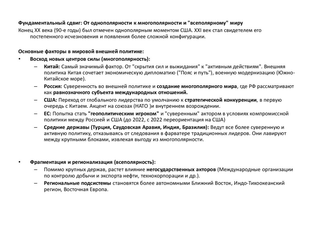 Фундаментальный сдвиг: От однополярности к многополярности и "всеполярному" мируКонец XX века (90-е годы) был отмечен однополярным моментом США. XXI век стал свидетелем его