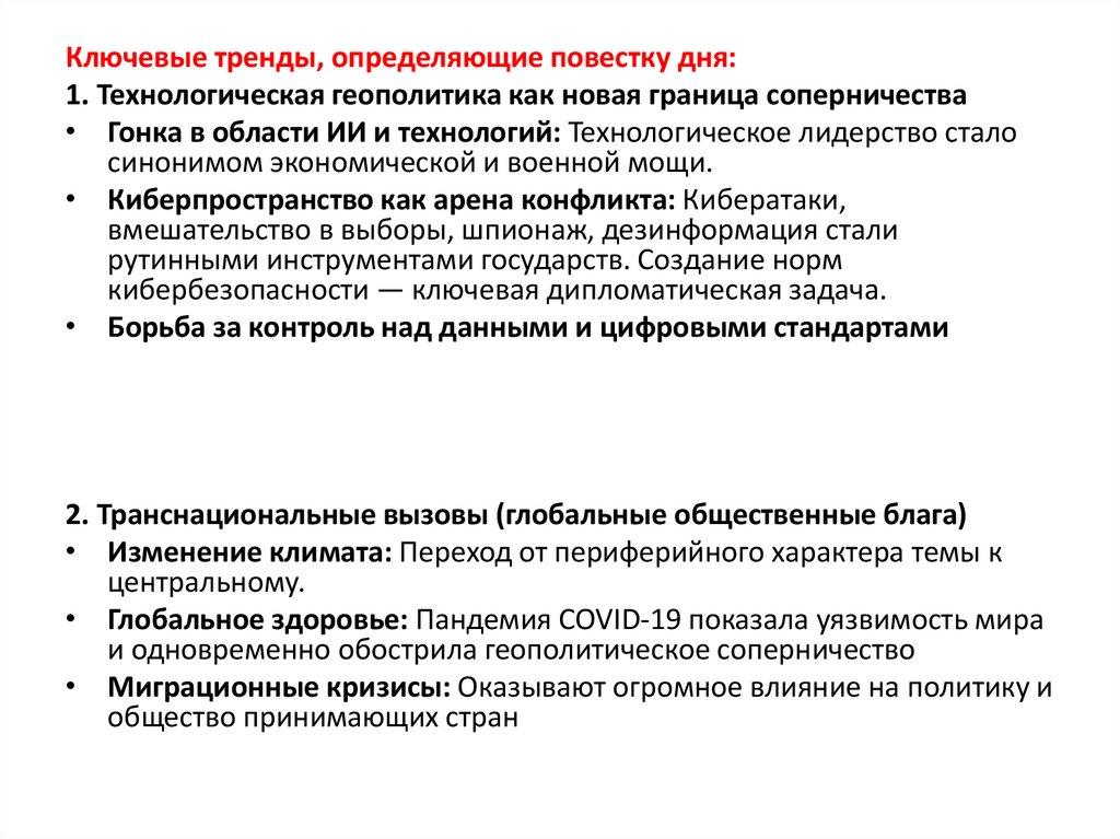 Ключевые тренды, определяющие повестку дня:1. Технологическая геополитика как новая граница соперничества