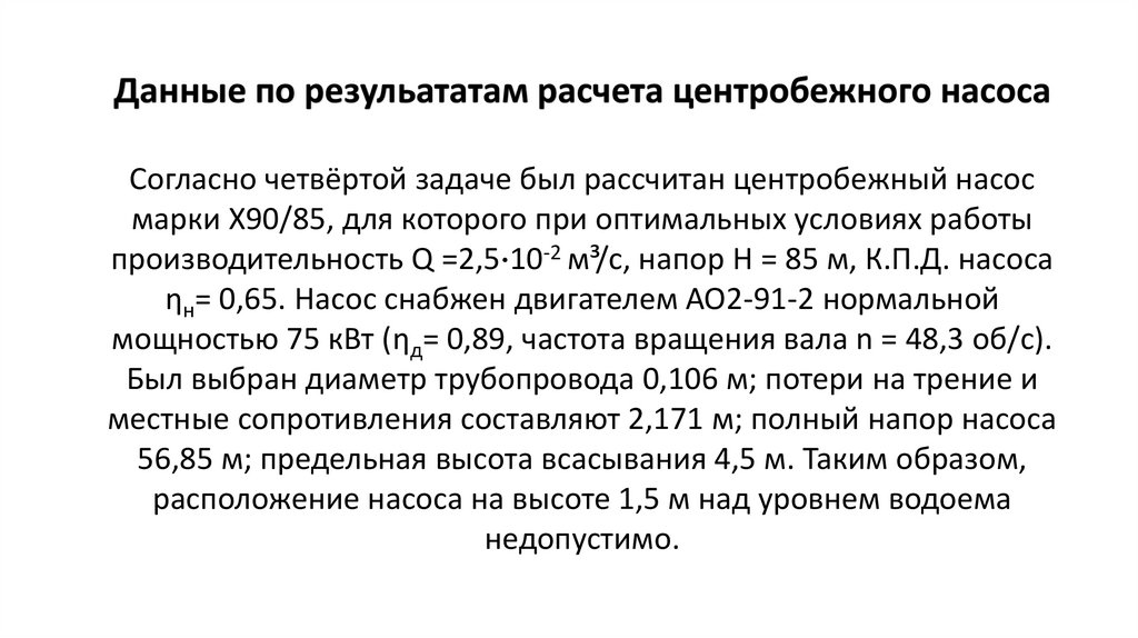 производительность Q =2,5∙10-2 м³/с, напор H = 85 м, К.П.Д. насоса