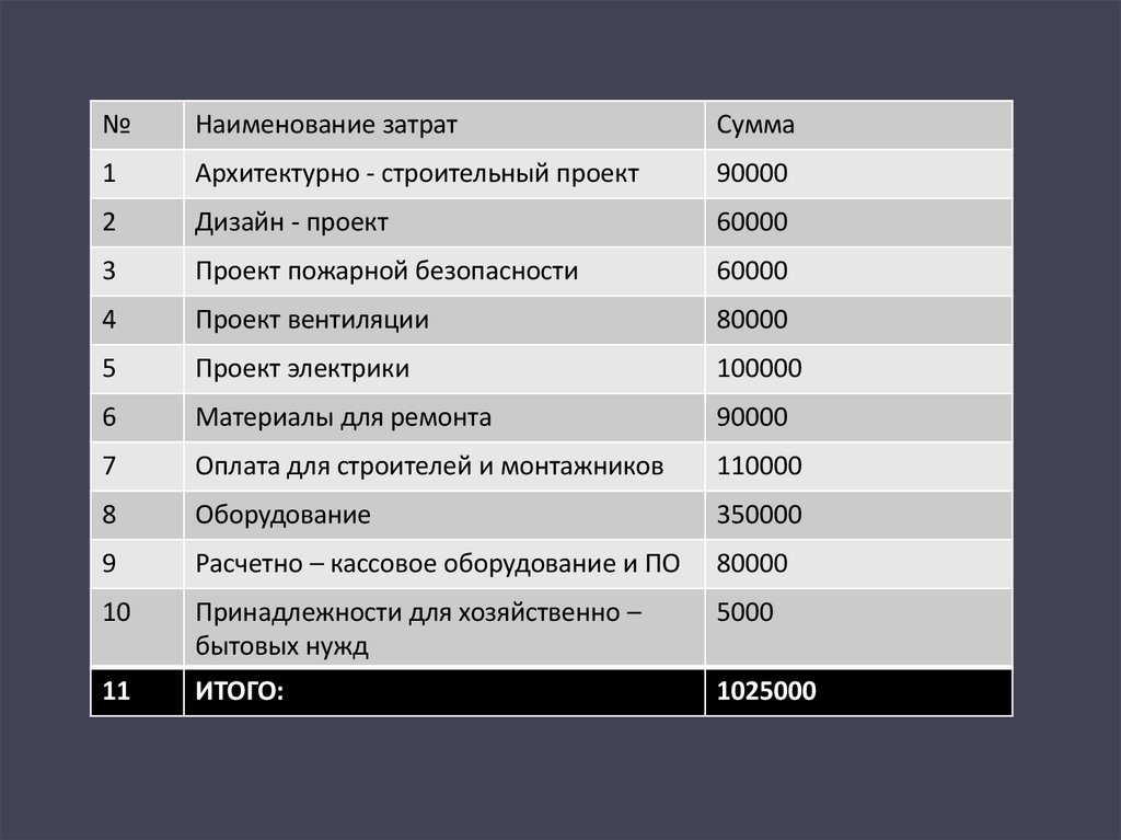 Общая сумма вложений: 1.728.000 руб, из них 1.000.000 – собственные средства, а