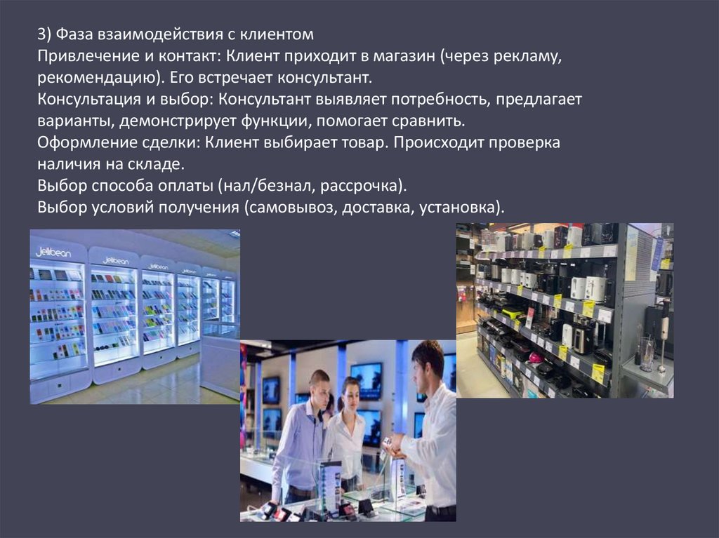 3) Фаза взаимодействия с клиентомПривлечение и контакт: Клиент приходит в магазин (через рекламу,