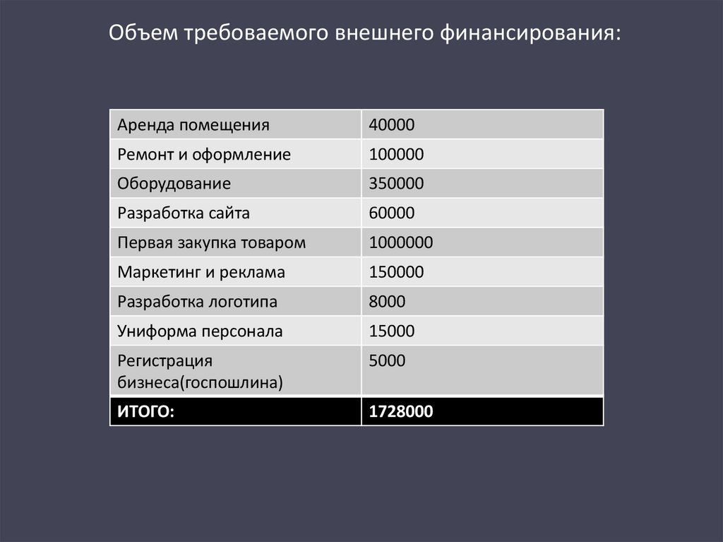 Объем требоваемого внешнего финансирования:Аренда помещения