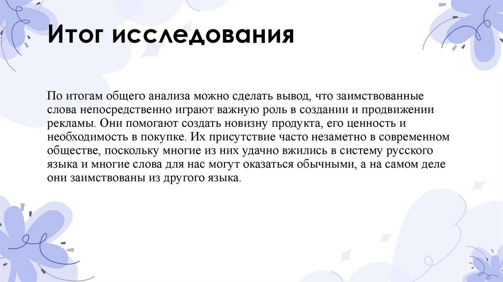 Итог исследованияПо итогам общего анализа можно сделать вывод, что заимствованные